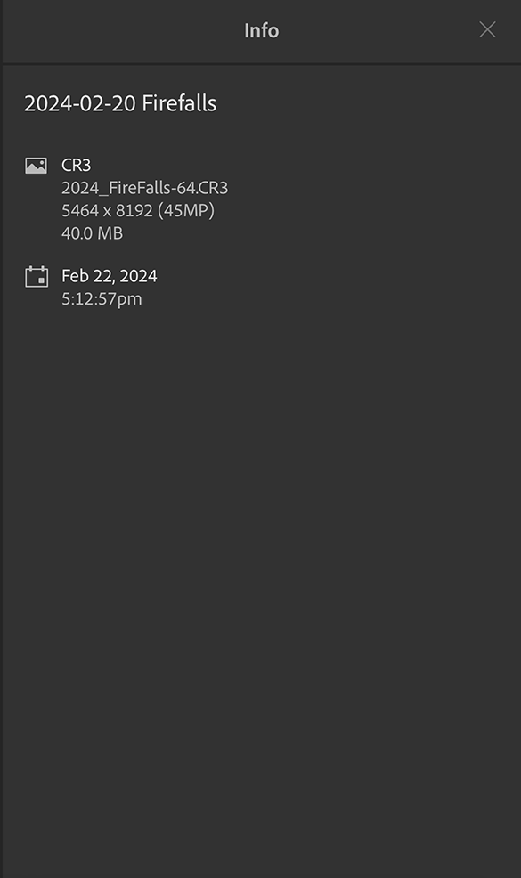 3. Note the file name on the detail screen. The file name will be in the format Event_Name_Number.CR3 or Event_Name_Number.DNG. That number will be the way that we work together on your selected photos.
